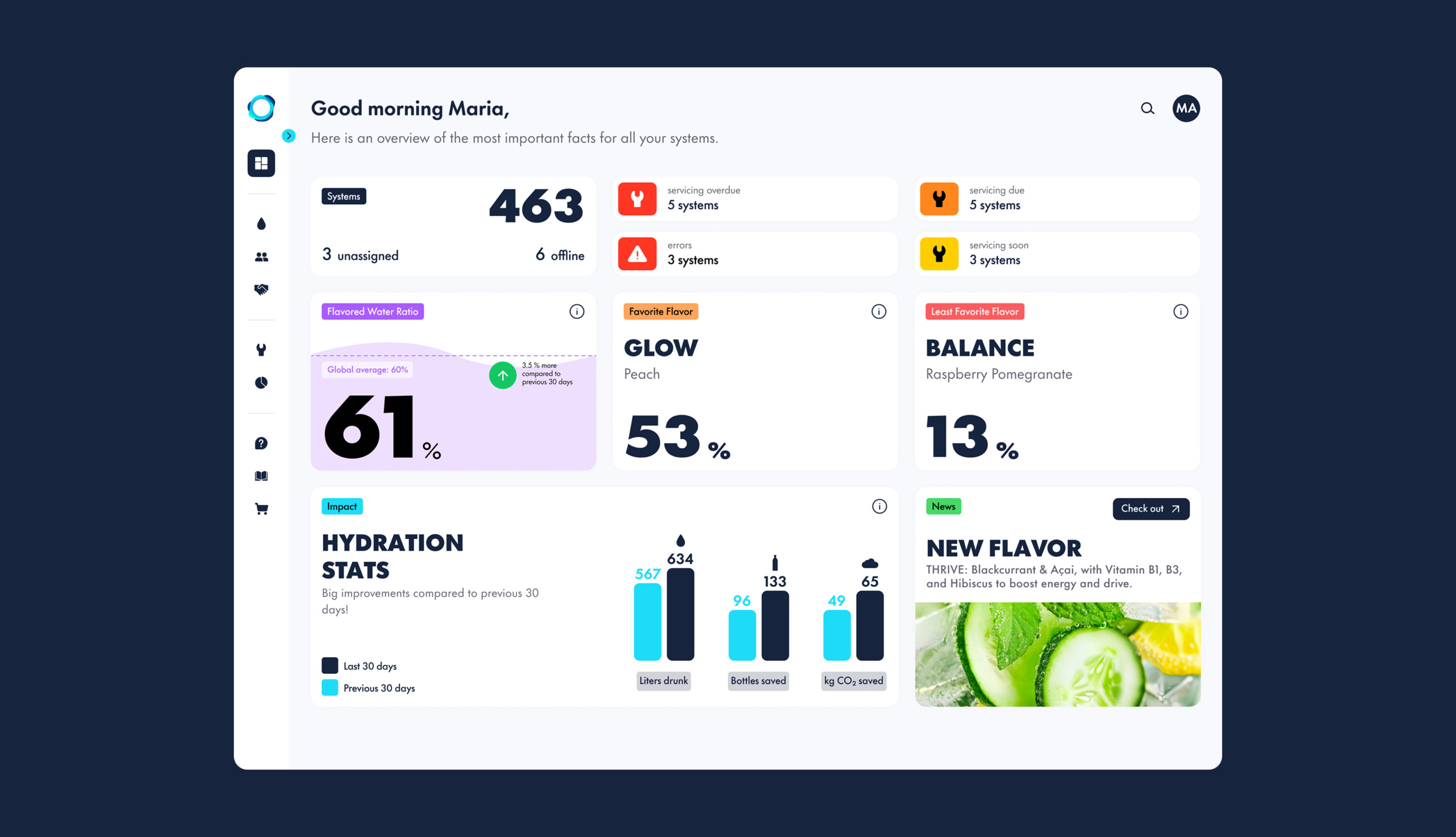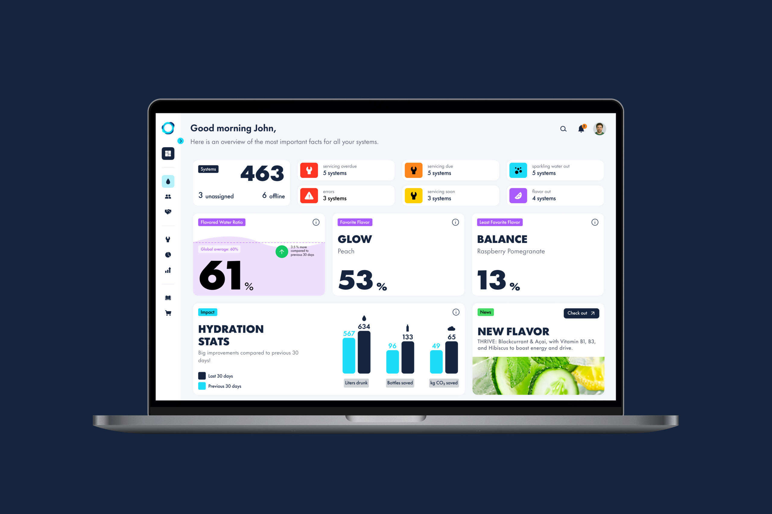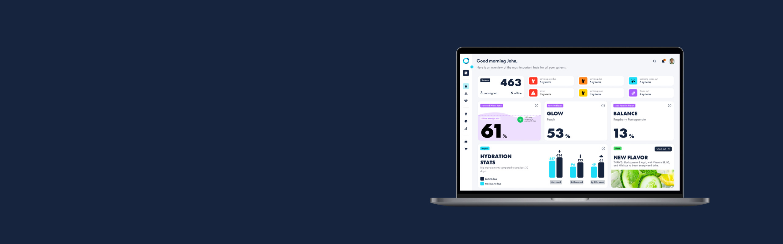 Aura is a fleet management platform that monitors drink dispensers, tracking operational status and flagging issues or flavors that need restocking. Beyond day-to-day monitoring, it provides business insights to support more informed commercial decisions.